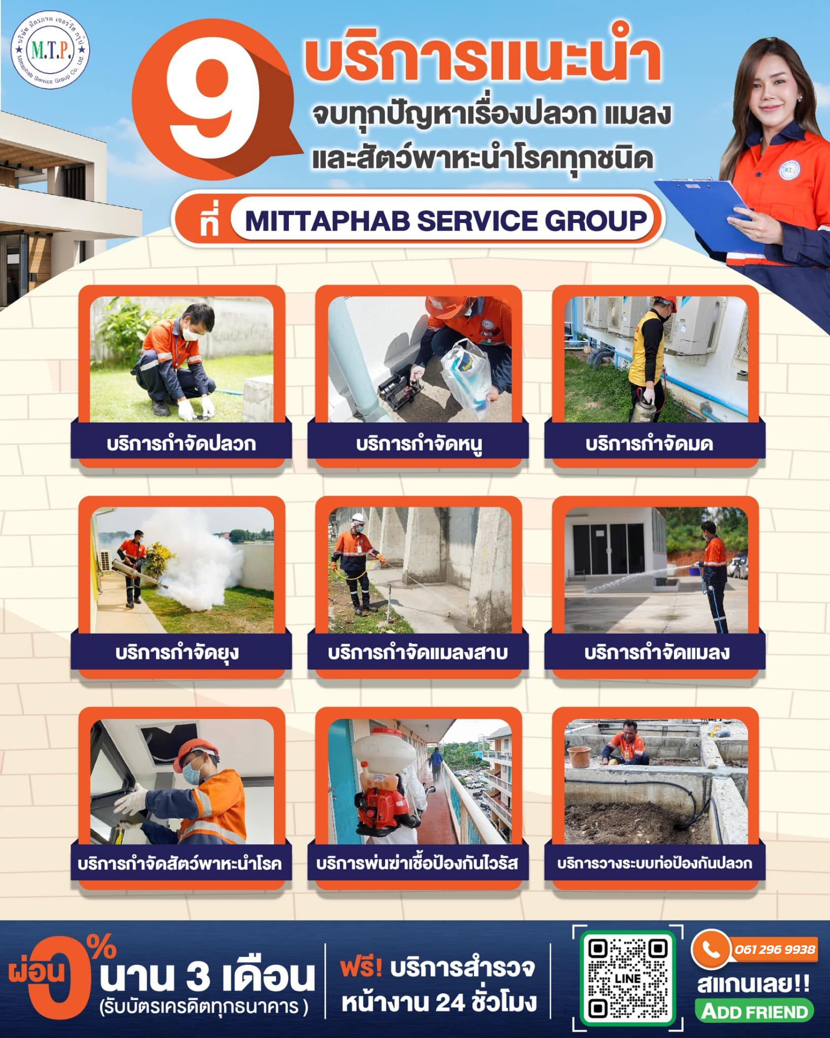 ให้บริการกำจัดปลวก มด หนู ยุง แมลงสาบ และสัตว์พาหะนำโรคทุกชนิด ภายใต้แนวคิดการบริการ “บริการดี แก้ปัญหาได้ เรียกใช้ง่าย เน้นคุณภาพ” ซึ่งทุกขั้นตอนการทำงาน จะถูกควบคุมโดยทีมงาน และผู้บริหาร ประสบการณ์กว่า 20+ ปี จึงทำให้เป็นบริษัทกำจัดแมลงชั้นนำของประเทศ